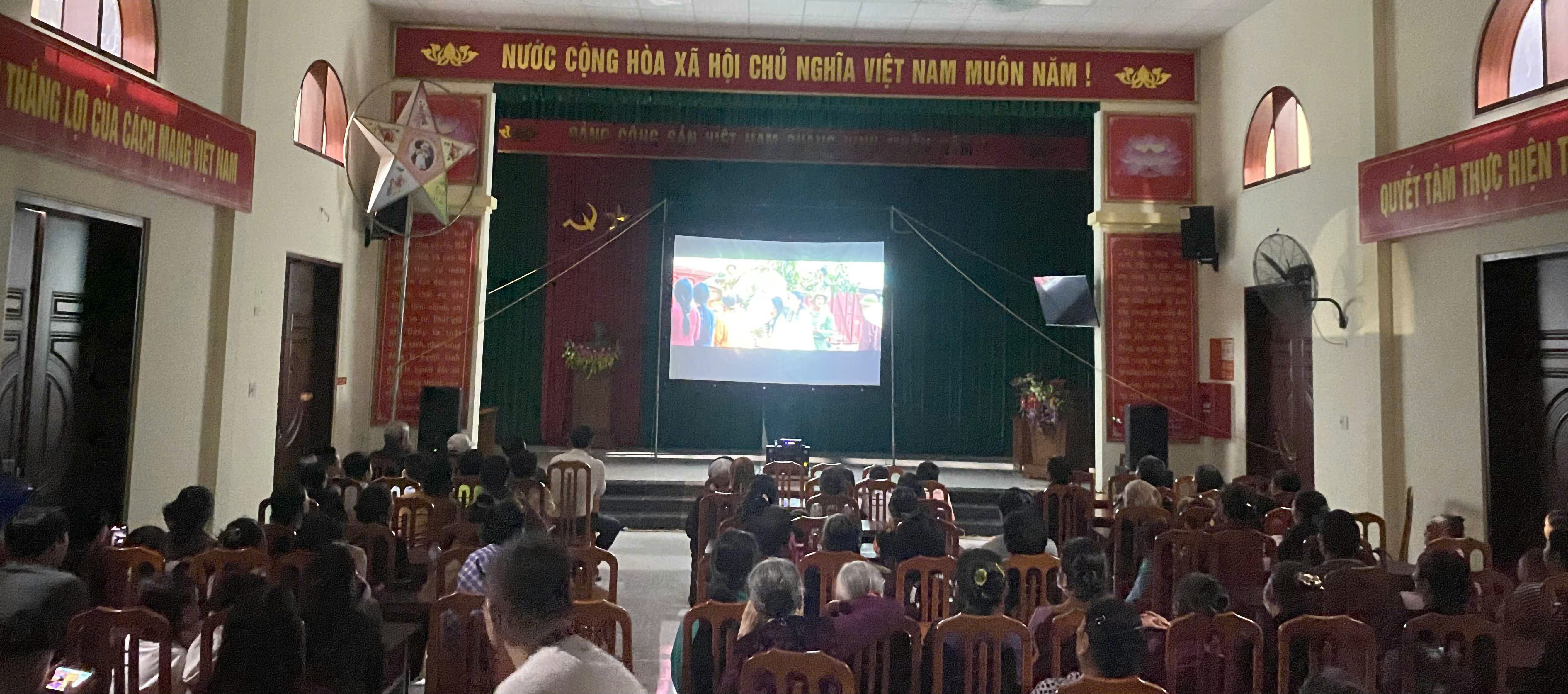 Ảnh: Buổi tổ chức chiếu phim trên màn hình lớn tại Quảng trường Lương Vưn Năm, xã Tân Yên