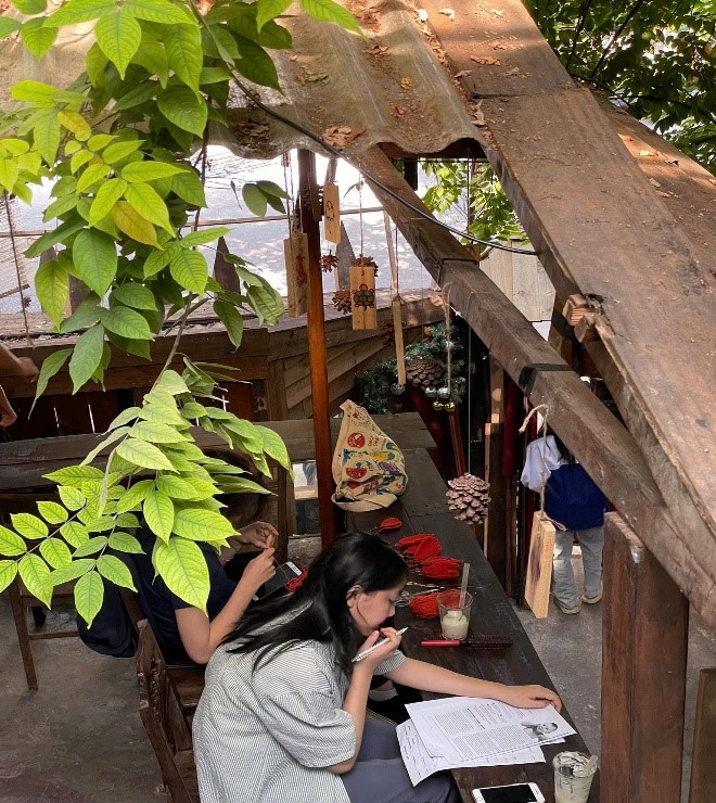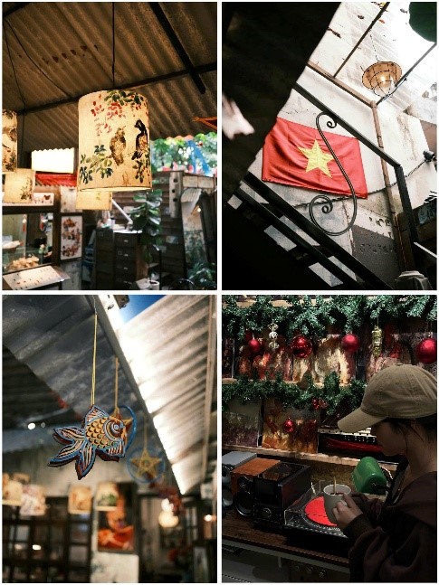 Tổng thể không gian được sử dụng chất liệu gỗ, tạo cảm giác gần gũi ngay từ khoảnh khắc bước vào. Tông màu nâu trầm kết hợp ánh đèn vàng khiến tạo nên sự ấm áp và dễ chịu. Những bộ bàn ghế gỗ đơn giản nhưng tinh tế góp phần giữ lại nét đẹp bình yên của quán. Các chi tiết trang trí nhỏ như tranh treo tường, lọ hoa khô hay kệ sách gỗ khiến nơi đây thêm phần thân thuộc. Tất cả các chi tiết đó tuy nhỏ nhắn nhưng lại tạo nên sự hòa quyện mở ra một không gian vừa ấm cúng vừa đầy chất thơ.