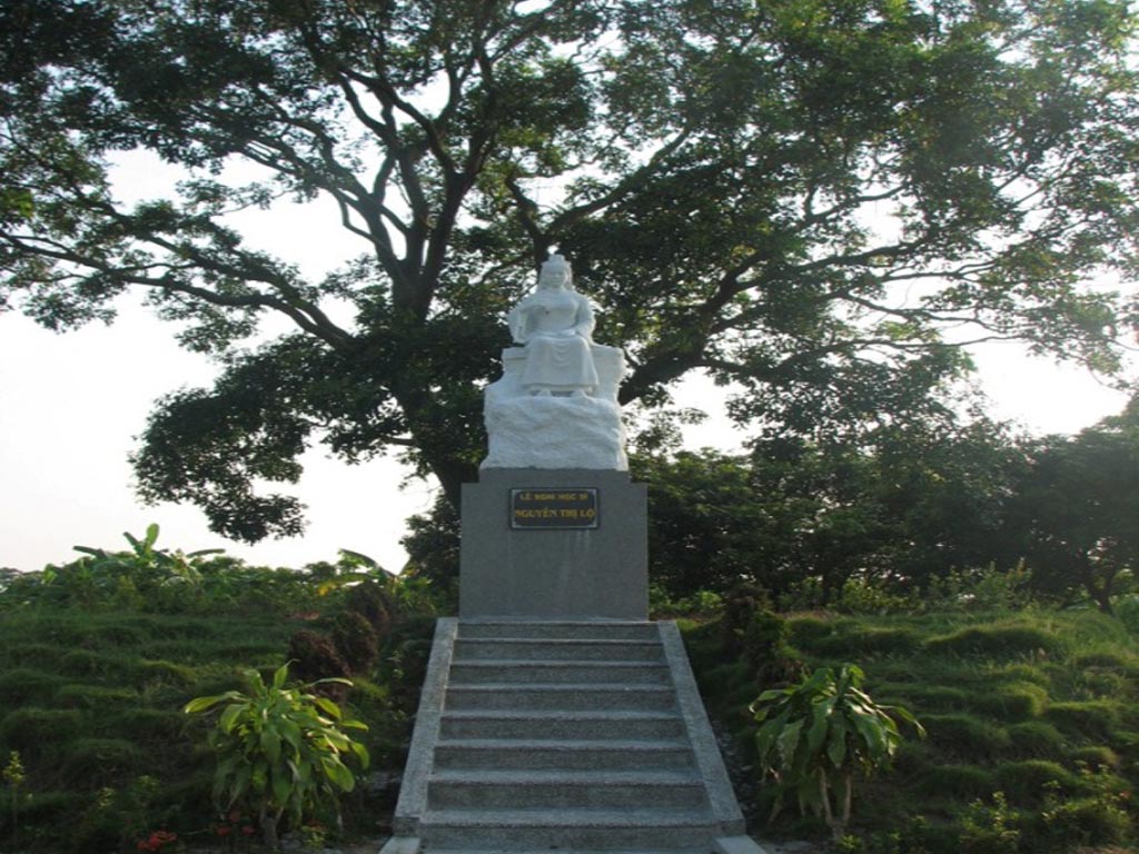 Bên phải đền thờ đặt tượng Nguyễn Trãi và Nguyễn Thị Lộ. Theo tài liệu lưu tại đền, hai bức tượng được được tạc bằng đá trắng của núi Ngũ Hành Sơn. Toàn thể hai bức tượng có bệ tượng cao 1442cm, tượng cao 168cm đây là những con số mang ý nghĩa lịch sử, ngày 16 tháng 8 năm 1442 đã xảy ra vụ án Lệ Chi Viên. Tay tượng Nguyễn Thị Lộ cầm bút như đang viết lên trời xanh thể hiện tấm lòng trong trắng trung trinh cùng hoài bão lớn lao của những người vì dân vì nước. Sau lưng là dãy núi Thiên Thai hình rồng uốn khúc, bên trái là sông Thiên Đức, xưa là con đường giao thông huyết mạch toàn vùng Đông Bắc. Phía trước, xa xa là Côn Sơn quê ngoại của Nguyễn Trãi. Bên cạnh là bức tượng Nguyễn Trãi làm từ đá trằng nguyên khối kích thước bằng với tượng bà Nguyễn Thị Lộ. Tư thế tượng được đặt theo tư thế ngồi, đầu đội mũ cánh chuồn, tay trái tượng cầm lệnh bài, tay phải tượng đặt lên đùi. Phía trước tượng đặt bình hương bằng đá lớn. Việc đặt tượng Nguyễn Trãi, Nguyễn Thị Lộ đền thờ để tỏ lòng ngưỡng mộ, thương tiếc của hậu thế với những người tài hoa nhưng gặp bất trắc cuối đời.