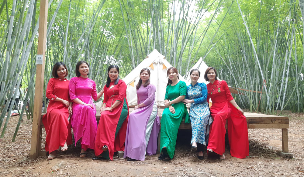 Du khách chụp ảnh bên rừng trúc, điểm du lịch cộng đồng Bản Ven, xã Xuân Lương (Yên Thế).