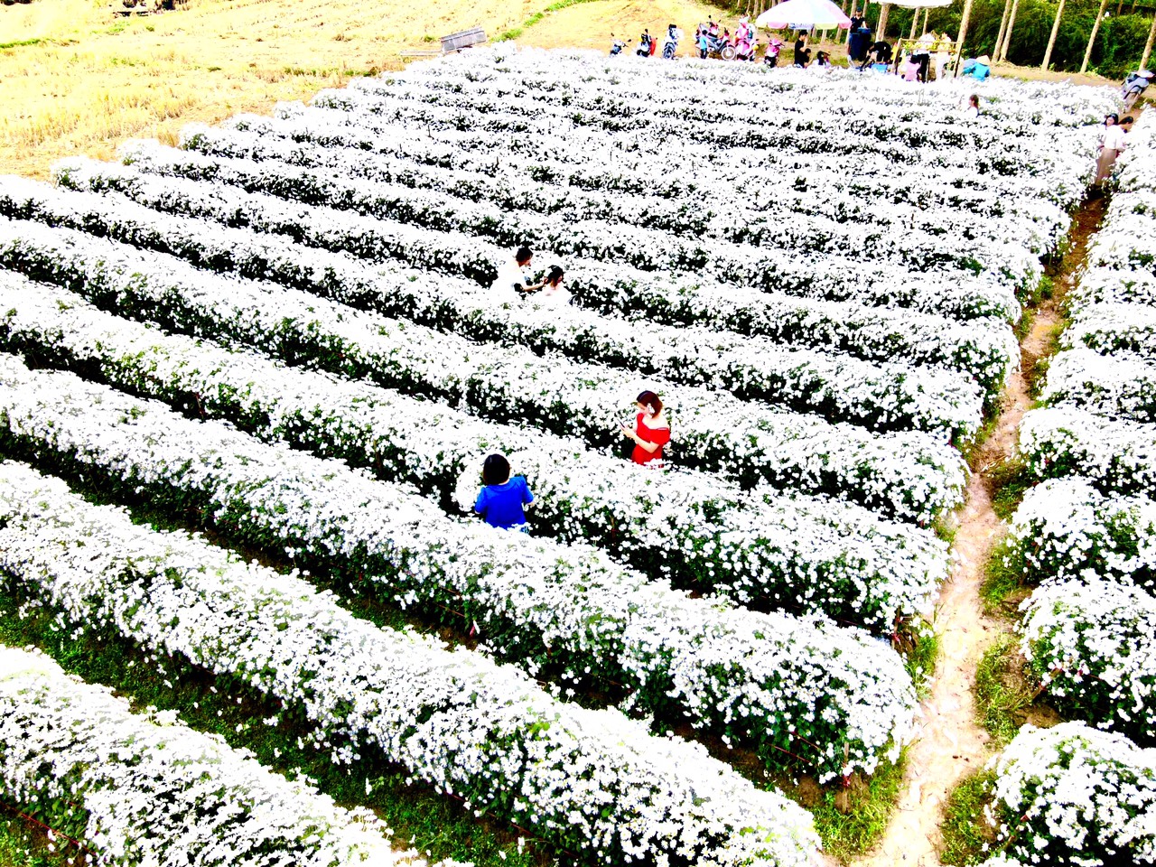 Phong cảnh vườn cúc họa mi trắng bông như tuyết ở thôn Vườn, xã Cương Sơn ( ảnh nhìn từ trên cao).