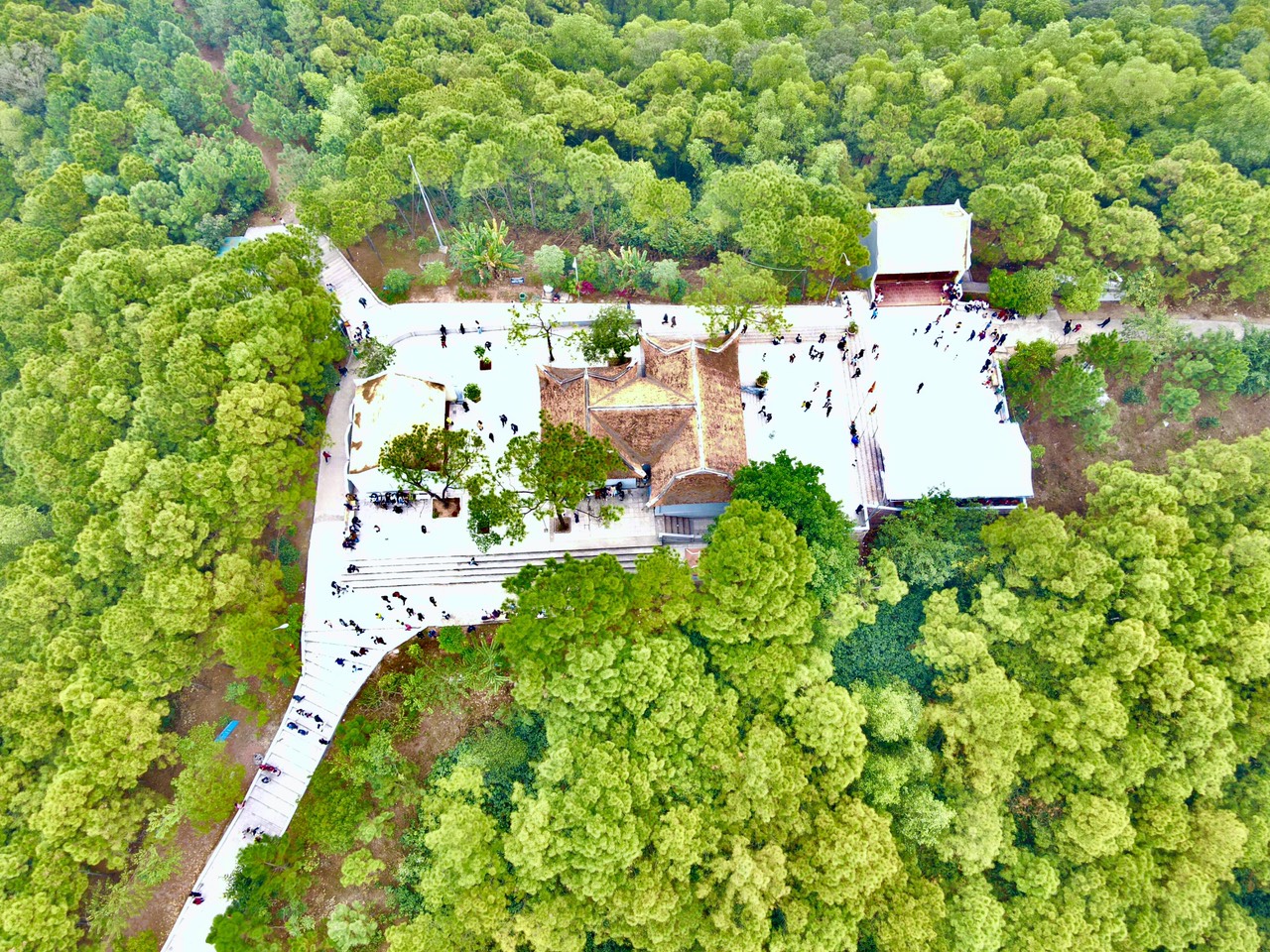 Toàn cảnh đền Thượng và đền Mẫu và nhà sắp lễ trên đỉnh ngọn núi Dành. (Ảnh chụp từ trên cao).