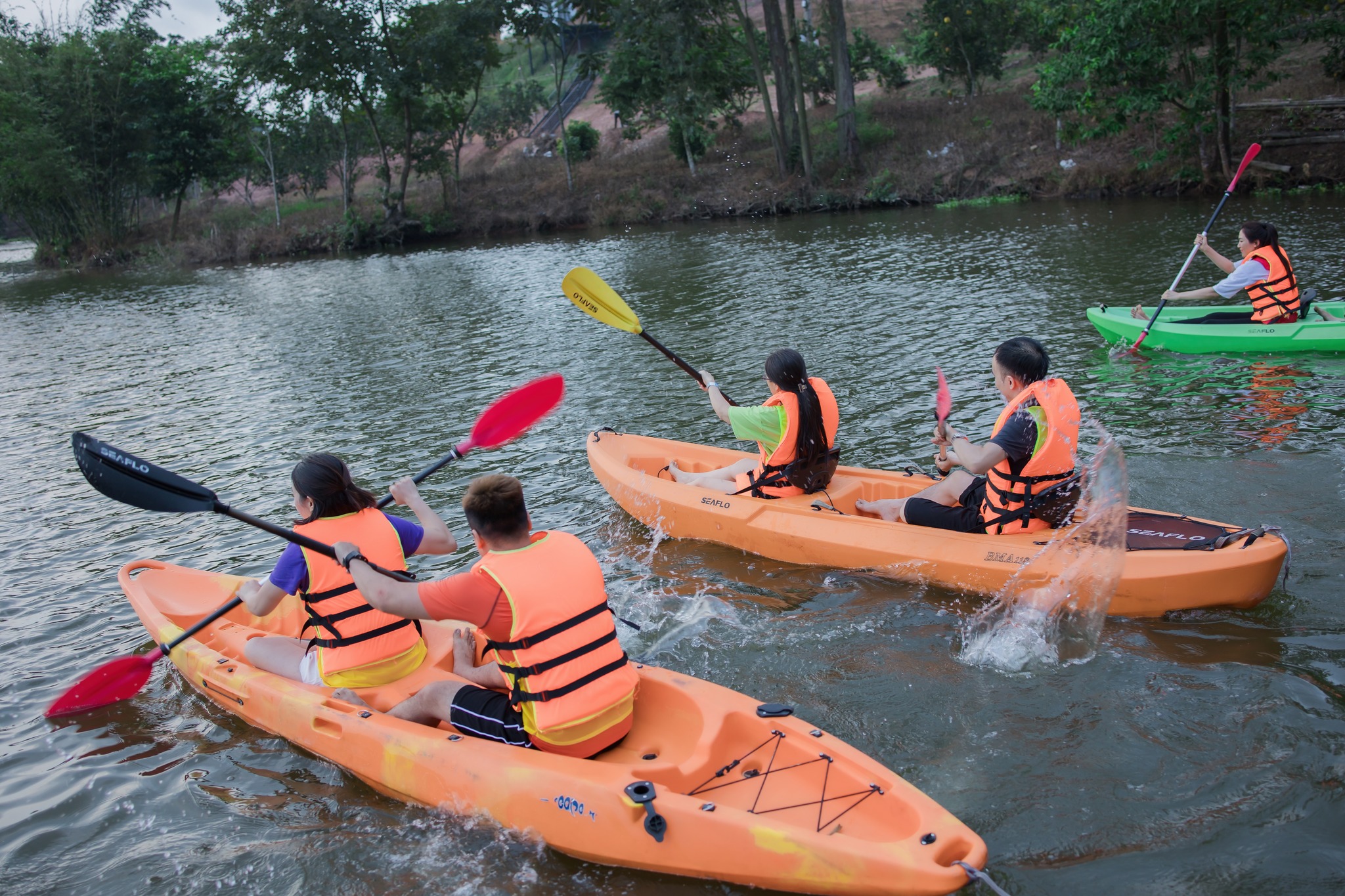Đến với Bầu Tiên, du khách có thể tham gia nhiều hoạt động phù hợp với mọi lứa tuổi và nhiều nhóm du lịch khác nhau như: Đạp xe quanh khu vườn cây ăn quả, đường mòn bên hồ; đi dạo, thư giãn trên thảm cỏ; câu cá trên hồ sinh thái; đạp vịt Hồ Bầu Lầy; thăm trang trại nuôi cừu, trượt thảm cỏ cầu vồng…. Một trong những hoạt động được yêu thích nhất tại đây là chèo thuyền trên hồ. Ngồi trên chiếc thuyền nhỏ, lướt nhẹ trên mặt nước trong veo, du khách có thể cảm nhận trọn vẹn vẻ đẹp yên ả của núi rừng. Không tiếng còi xe, không âm thanh ồn ã, chỉ có tiếng mái chèo khua nhẹ và tiếng chim trong vòm lá – một khoảnh khắc đủ để khiến bất kỳ ai khi đến đây cũng thấy lòng nhẹ bẫng. Nhờ không gian rộng thoáng, Bầu Tiên rất phù hợp cho các buổi cắm trại, picnic cuối tuần. Bãi cỏ rộng ven hồ là nơi lý tưởng để dựng lều, trải thảm và tổ chức bữa ăn ngoài trời. Khi muốn nghỉ ngơi dài ngày, du khách có thể lựa chọn giữa các hình thức lưu trú nghỉ dưỡng đa dạng và đầy đủ tiện nghi từ cắm trại view hồ, bungalow sườn đồi hay nhà sàn truyền thống. Các phòng bungalow có sức chứa từ 6 đến 8 người, phù hợp với mô hình gia đình, nhóm bạn đi chơi, nghỉ ngơi vào dịp cuối tuần. Các phòng đều có không gian riêng tư, đầy đủ tiện nghi tiêu chuẩn. Các nhà sàn cộng đồng có sức chứa gần 500 lượt khách ăn uống cùng lúc. Với bất kể hình thức lưu trú nào cũng hứa hẹn đem lại trải nghiệm trọn vẹn nhất cho du khách ghé thăm.